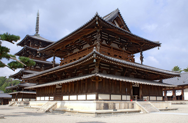 Самые старые деревянные здания находятся возле буддистского храма Хорю-дзи в японском городе Икаруга. Четыре постройки сохранились в целости до наших дней, хотя их строительство началось в 587 году нашей эры (период Асука) по приказу императора Йомея, а его наследники завершили храм в 607 году. Исходный комплекс сгорел в 670 году, но был реконструирован к 710 году. Строительный комплекс состоит из центральной пятиэтажной пагоды, Золотого зала, внутренних ворот и деревянного коридора, который окружает центральную территорию.