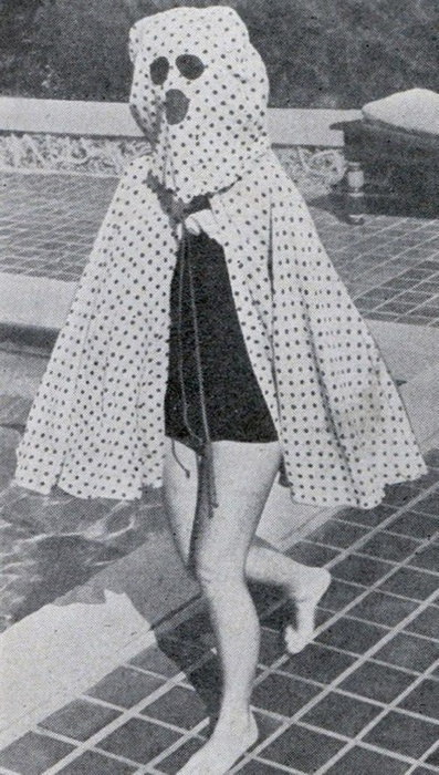 Солнцезащитного крема не существовало до середины 1940-х годов, и любители поваляться на пляже вынуждены были искать способ защитить свою кожу от вредного воздействия солнечных лучей. Поэтому пользовались накидками со встроенными солнцезащитными очками.