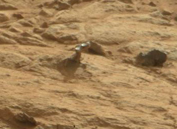 Глядя на этот снимок Curiosity 2013 года, можно представить себе что угодно, только не обычный камень. Например, что это торчащий из песка молоток. Отломившаяся деталь марсохода. Или действительно ручка от двери, ведущей в таинственные подземные дома марсиан. Но ученые и здесь не видят ничего необычного и настаивают, что это камень. Металлический блеск говорит о том, что объект имеет твердую мелкозернистую структуру и до гладкости "отполирован" марсианскими ветрами.