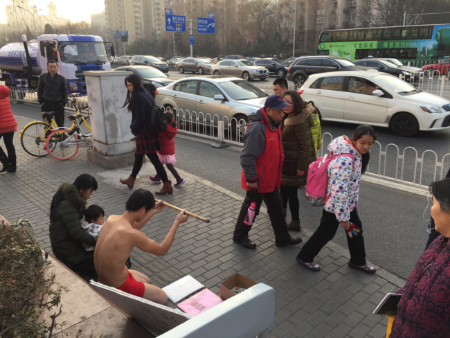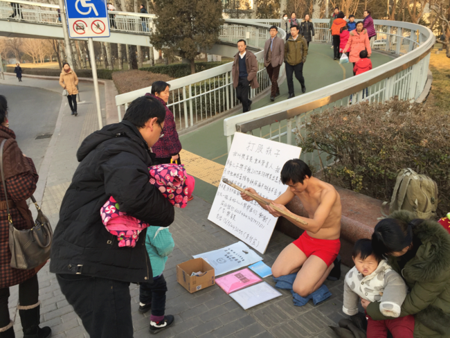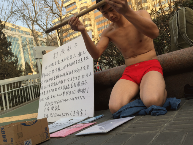 Житель Пекина Фан Фуджи встал на колени и предложил прохожим ударить его палкой всего за 10 юаней (1,5 доллара). Таким способом он хотел собрать необходимую сумму для операции его годовалого ребенка.
