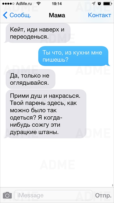 Американке Кейт Сигель повезло: ее мама не только любит давать советы и обладает отменным чувством юмора, но еще и обожает писать SMS. У Кейт накопилось столько шедевральных сообщений, что она начала выкладывать их в Instagram и Twitter, и ее мама сразу же обрела сотни тысяч поклонников. AdMe.ru перевел сообщения еврейской мамы Кейт и еще раз убедился: все-таки мамы одинаковы во всем мире.