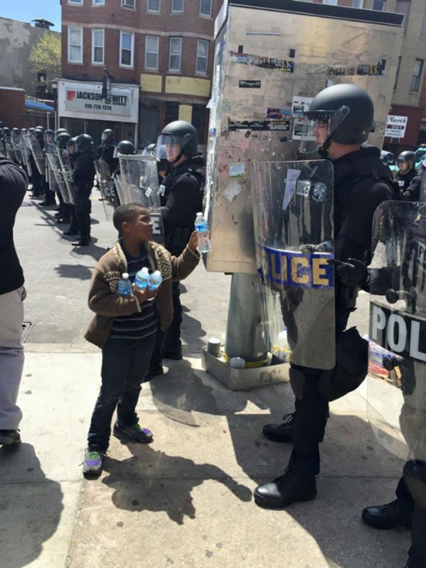Мальчик предлагает бутылку воды полицейскому в жаркий день.