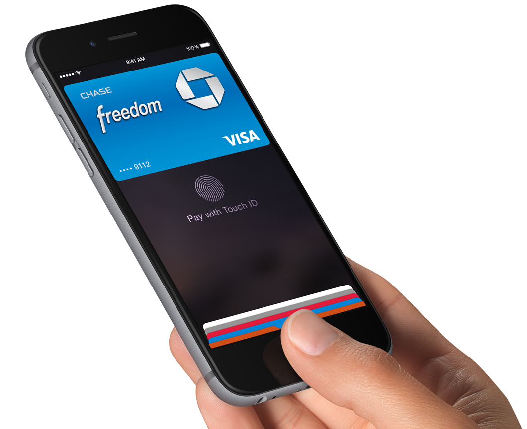 Система Apple Pay, созвучная Apple pie ("яблочный пирог"), позволит совершать бесконтактную оплату покупок в обычных магазинах. Смартфоны заменяют кредитные карты. В основе технологии лежит чип NFC и дактилоскопический сенсор Touch ID, идентифицирующий владельца по отпечатку пальца.