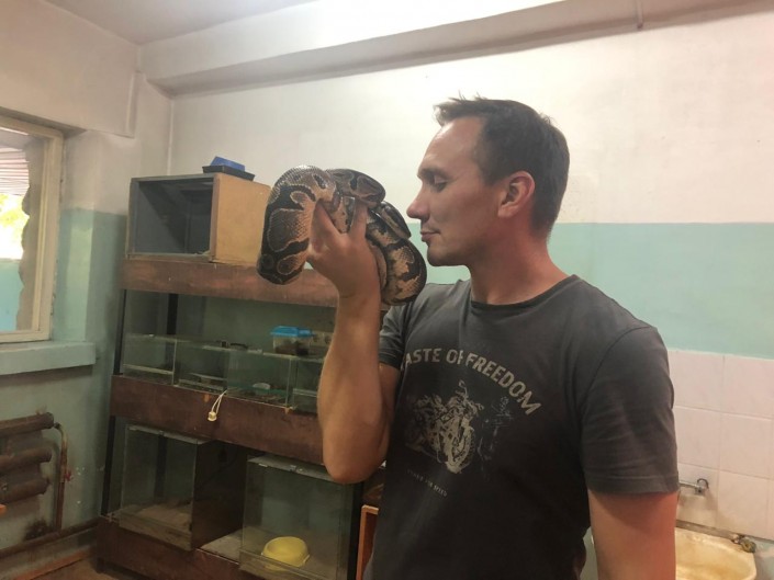 38-летний Александр Гурнев с 1997 года работает в Алматинском зоопарке. Сейчас заведует экзотариумом (место содержания и показа посетителям экзотических животных), в котором проживают 76 змей 39 видов. К каждому из этих животных нужно найти индивидуальный подход. Для змеи создаются условия, повторяющие климат в их родных странах, учитывается время ее размножения.