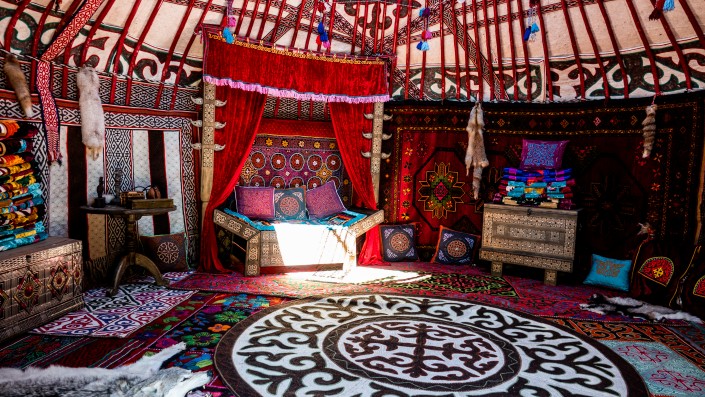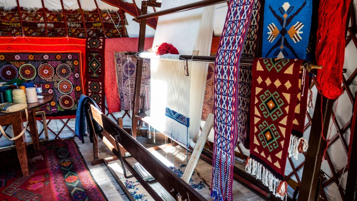 Мастер занимается созданием юрт, шьет корпешки, изготавливает сундуки и ткет ковры.