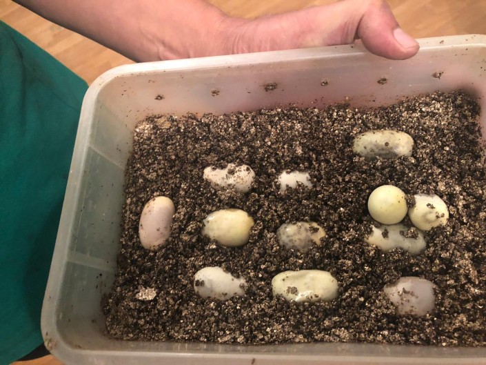 "Бывает, змея во время родов откладывает неоплодотворенные яйца. А иногда только часть из них оплодотворенная. Также сталкиваемся со случаями, когда некоторые яйца откладываются, а остальные остаются в яйцеводах. Тогда мы проводим так называемое кесарево сечение, проводим операцию, вынимаем яйца из яйцеводов, зашиваем обратно. Яйца перемещаются в инкубатор, в среднем на 60 суток, потом вылупляются детеныши", - рассказывает собеседник, показывая яйца змей.