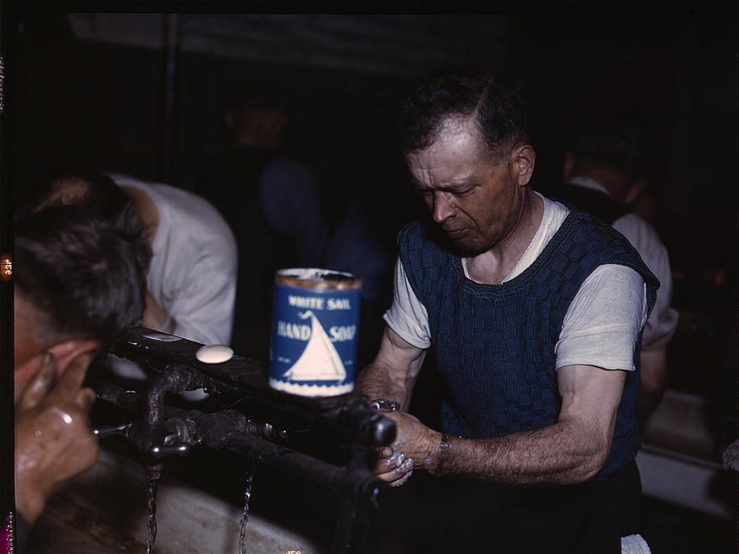 Джозеф Кленскен умывается после рабочего дня на сортировочной станции в Чикаго. Фотограф Джек Делано
