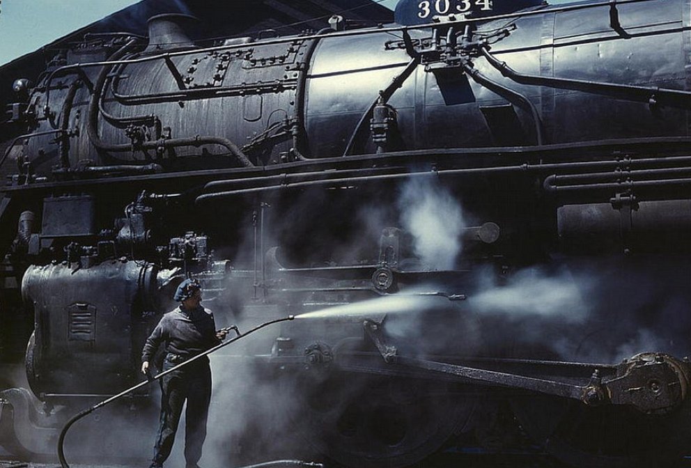 Неженская работа: Виола Сиверс моет локомотив серии H в Клинтоне, штат Айова, апрель 1943 года