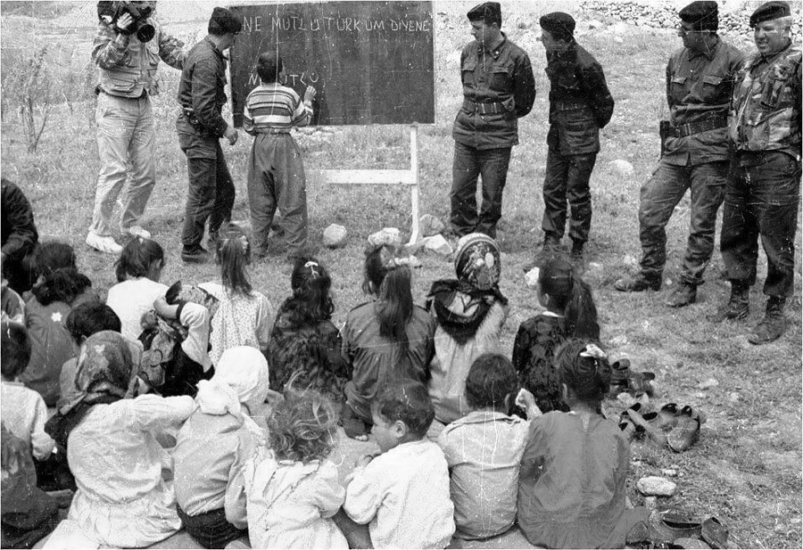 Под присмотром офицеров турецкой армии курдские дети пишут на доске "Как счастлив тот, кто называет себя турком".