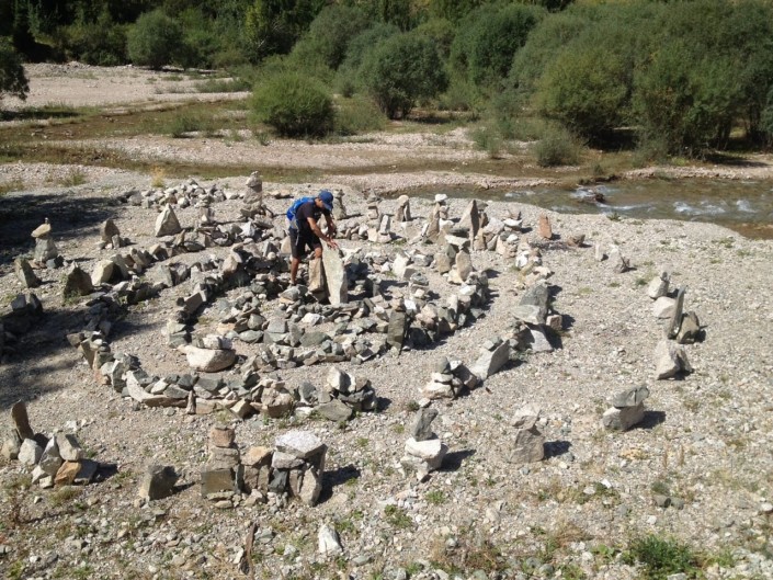 "Лично я геоглиф видел на Иссык-Куле. Это мотивировало меня создать у нас рисунок, видный с птичьего полета. Для ребят это хорошая физическая подготовка, сплоченность, хорошее настроение, отдых. Это символизирует связь с природой. Очень здорово находиться в горах, возле реки, в окружении снежных вершин, деревьев. Чертеж мы сделали с помощью веревки. Сколько камней перетаскали - сосчитать невозможно. Когда ты на месте, изображение не видно. Поэтому делали пирамиду, ставили камень на камень", - сказал тренер.