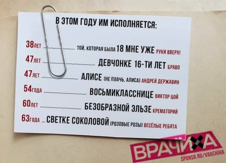 В Сети активно распространяется картинка, в которой подсчитали, сколько лет стало лирическим героям из знаковых песен прошлых десятилетий. На ней упоминаются песни российских и советских исполнителей, в том числе "18 мне уже" группы "Руки вверх" и "Восьмиклассница" Виктора Цоя.