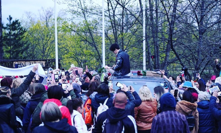 Встречающих было так много, что Димашу пришлось забраться на крышу автомобиля, сидя на которой он раздавал автографы и общался с поклонниками.