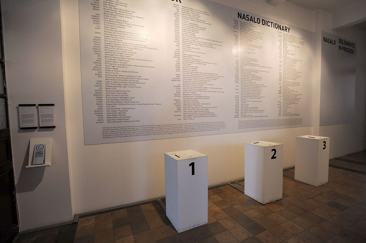 Очень интересный проект Sissel Tolaas "Communicate by smell". Идея проекта состоит в том, что мы составляем свое впечатление о городе по запахам. Она составила карту запахов Стамбула. Также в экспозиции были представлены некоторые из них - чтобы ознакомиться с ними, нужно просто нажать на кнопочку.