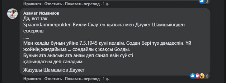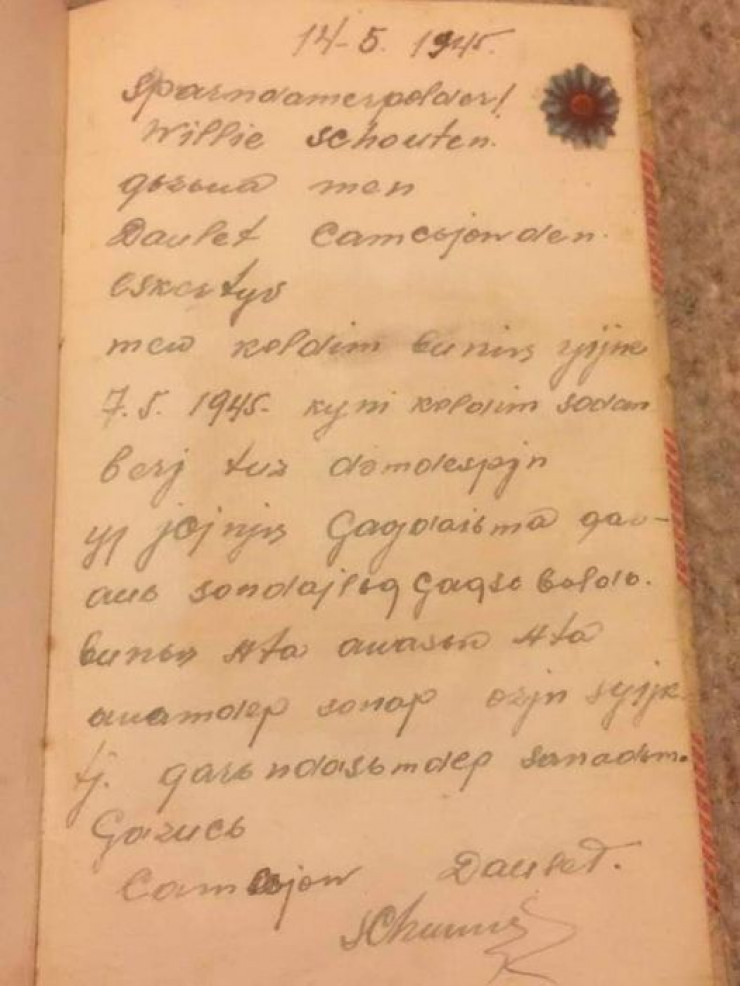 "По отдельным словам многое неясно, но смысл вырисовывается. Казах, может, бывший военнопленный, (регулярных частей РККА в Голландии не было), какое-то время гостил у голландской семьи Схаутенов возле Хаарлема. Он пробыл там с 7 по 14 мая 1945 года и оставил о себе запись в блокноте у хозяев (отсюда эта хорошая бумага). Желает хозяевам всего хорошего, а девочку называет сестренкой", - такую версию выдвинул Азамат Исмаилов.