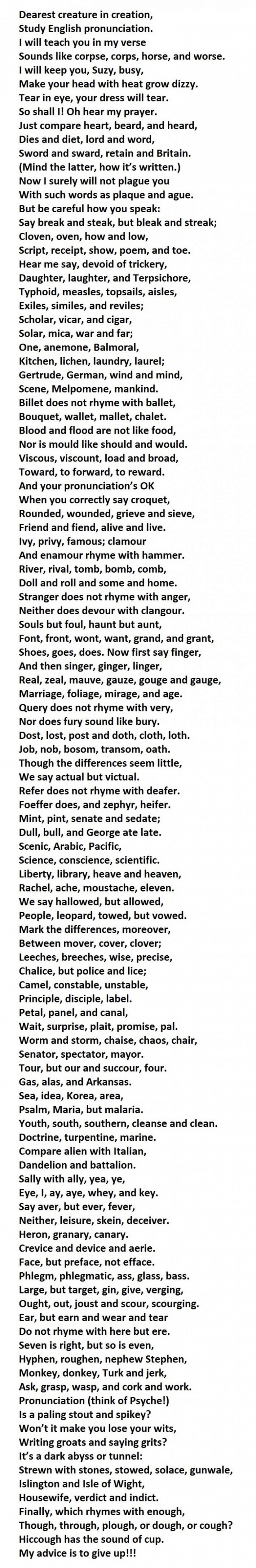 Если вы можете правильно произнести каждое слово в этом стихотворении, вы говорите по-английски лучше, чем 90 процентов носителей английского языка в мире. Убийственное стихотворение на правила чтения от Dr. Gerald Nolst Trenité (1870-1946). Непростая задача для всех уровней владения английским языком, вплоть до С2 и носителей языка.