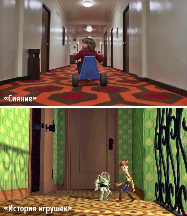 Ковер перед комнатой Сида в мультфильме "История игрушек" в точности повторяет ковровое покрытие в одном из коридоров отеля "Оверлук" в фильме "Сияние". Именно того коридора, в котором герой Джека Николсона пытается убить топором жену и сына.