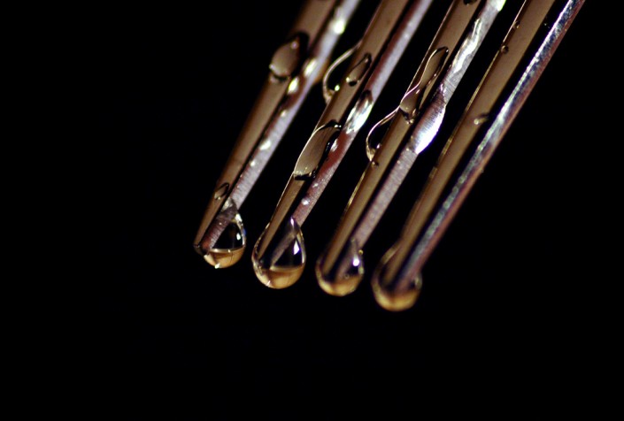 Поверхностное натяжение. Многие помнят опыты с пленками жидкостей, которые показывали на уроках физики в школе. Небольшую проволочную рамку с одной подвижной стороной опускали в мыльную воду, а затем вытаскивали. Силы поверхностного натяжения в образовавшейся по периметру пленке поднимали нижнюю подвижную часть рамки. Чтобы сохранить ее неподвижной, к ней подвешивали грузик при повторном проведении опыта. Это явление можно наблюдать в дуршлаге - после использования в дырочках дна этой кухонной посуды остается вода. Такое же явление можно наблюдать после мойки вилок - на внутренней поверхности между некоторыми зубьями также есть полоски воды.