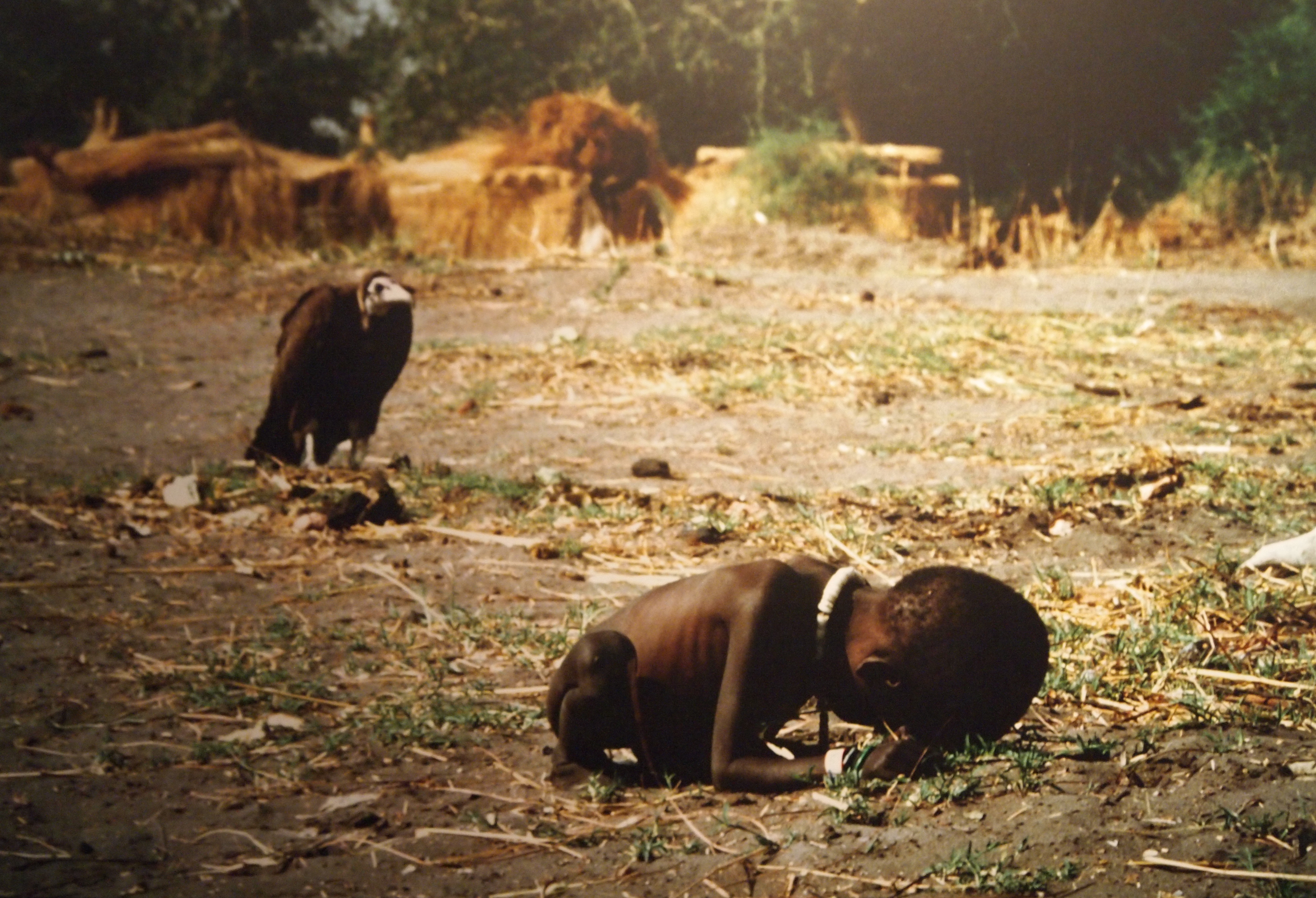 Кевин Картнер - фотокорреспондент из ЮАР получил за этот снимок широкую мировую известность и Пулитцеровскую премию (1994 год). На фотографии запечатлена умирающая от голода суданская девочка. Родители малышки временно покинули ее, чтобы помочь разгружать самолет с гуманитарной помощью. В это время к девочке подлетел стервятник, ожидающий ее смерти.