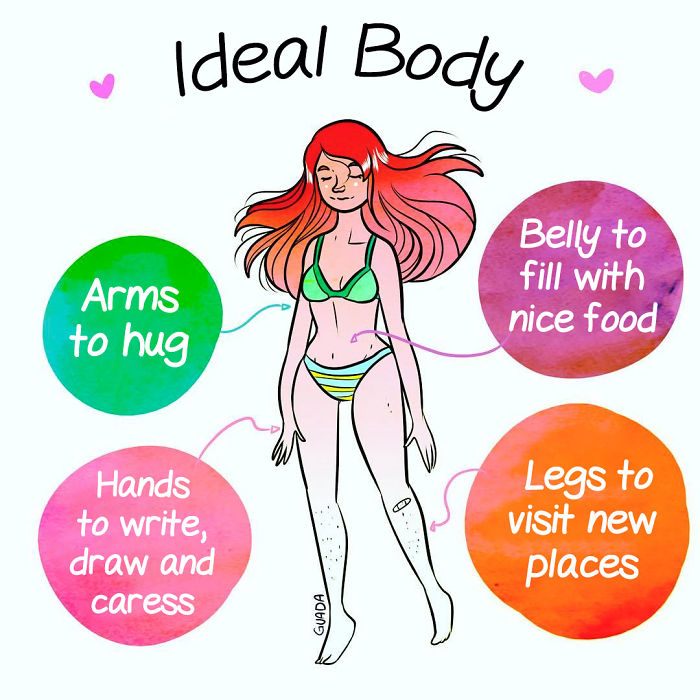 Идеальное тело - это, когда есть руки, чтобы обнимать, писать и рисовать, живот, который можно "набить" вкусняшками и ноги, чтобы посещать новые места.