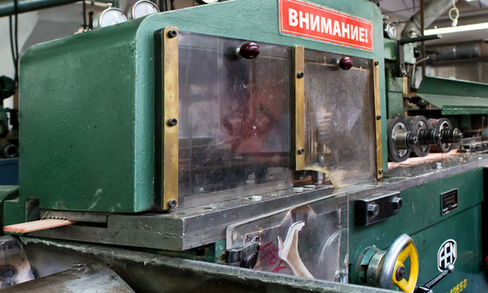 Полученный из бревна брус распиливают на короткие отрезки, каждый из которых затем распускают на десять дощечек. Чтобы все дощечки были одинаковыми, их нужно откалибровать. Для этого их прогоняют через специальный станок. На выходе из него дощечки имеют одинаковый размер и строго перпендикулярные грани.