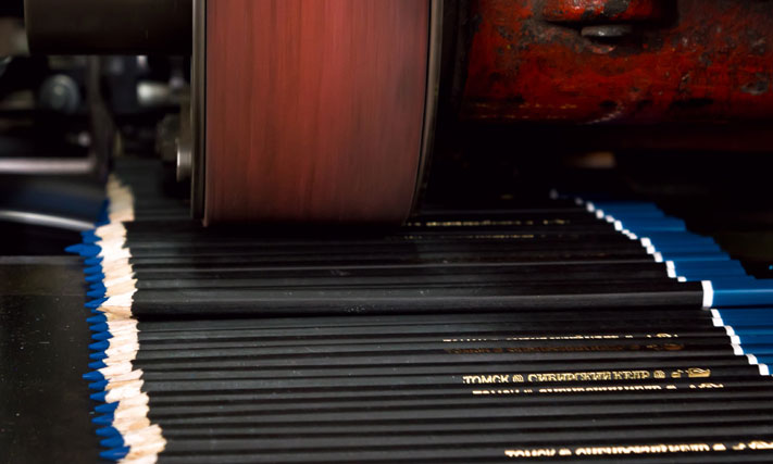 После покраски карандаши отправляют в цех финишной отделки. В этом месте они приобретают тот окончательный вид, в котором дойдут до потребителя. На карандаши наносят штамп, надевают ластик и затачивают.