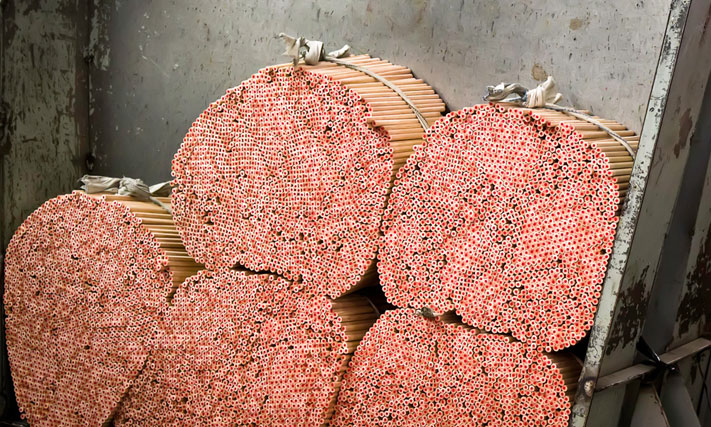 Затем откалиброванные дощечки помещают в автоклав. По своему внешнему виду он напоминает бочку, к которой подведено множество труб разного диаметра. При помощи этих труб в камере можно создавать вакуум, нагнетать давление и подавать внутрь всевозможные растворы. В результате этих процессов из дощечки удаляются содержащиеся в ней смолы, и древесина импрегнируется (пропитывается) парафином. На сегодняшний день это не самый простой, но один из самых эффективных способов улучшить важные свойства материала и защитить дерево от вредного воздействия окружающей среды.
