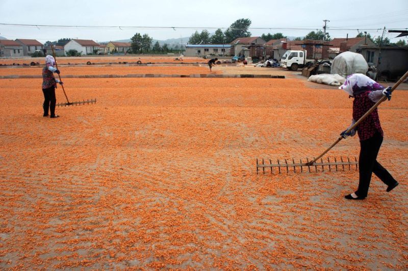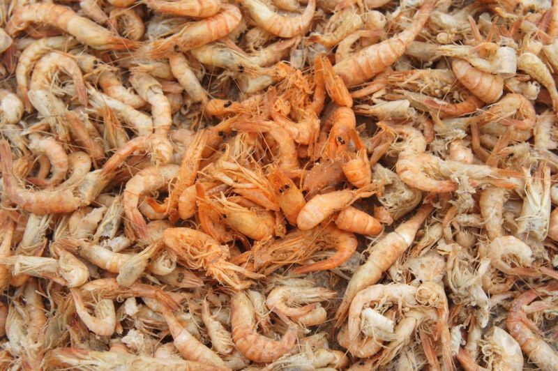 А далее все по технологии: свежевыловленные креветки опускают в чан на пару минут, туда же и заливают краситель. Позже креветок вымочат в растворе триполифосфата натрия. Триполифосфат натрия используется для фиксации свежести и для того, чтобы они лучше впитывали воду и становились тяжелее во время заморозки. Позже такую крашеную и пропитанную креветку отправляют на заморозку (глазировку). Иногда, по желанию заказчика, креветку не красят (такая креветка выходит дешевле (те некрашеные креветки, что на фото, пойдут на более дешевые снеки. А крашеная пойдет к нам на стол. Особенно много ее, рыженькой красавицы, в России и на Украине. Ну с крилем для снеков происходит практически то же самое, только его не будут вымачивать в триполифосфате, а после варки будут сразу сушить около пяти дней, в данном случае на земле. Потом эти креветки почистят (в сухом виде креветки начинают шелушиться и процесс чистки становится значительно легче, чем когда их чистишь сразу после варки), досушат и расфасуют.