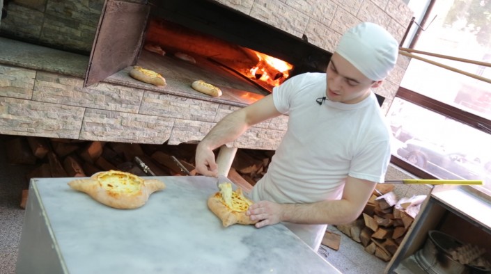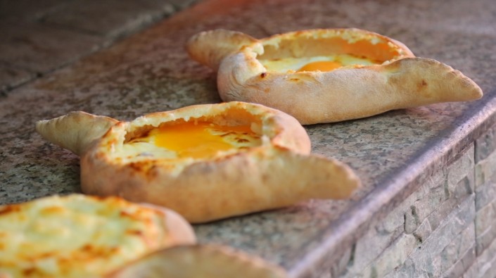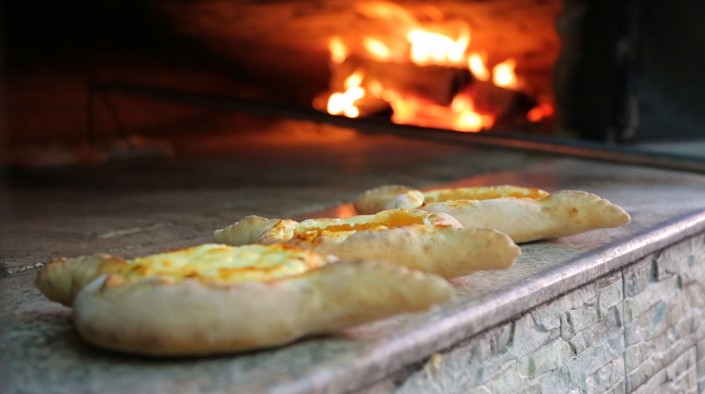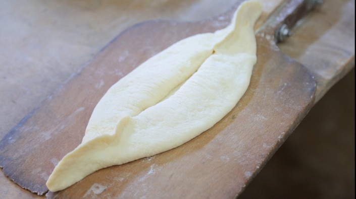 6. В середину лодочки накладываем начинку и кладем 2-3 кусочка сулугуни. И в печь на 5 минут. Кстати, в Батуми в ресторанах имеются самые что ни на есть настоящие печи на дровах, что придает особый вкус и запах этому кулинарному шедевру.