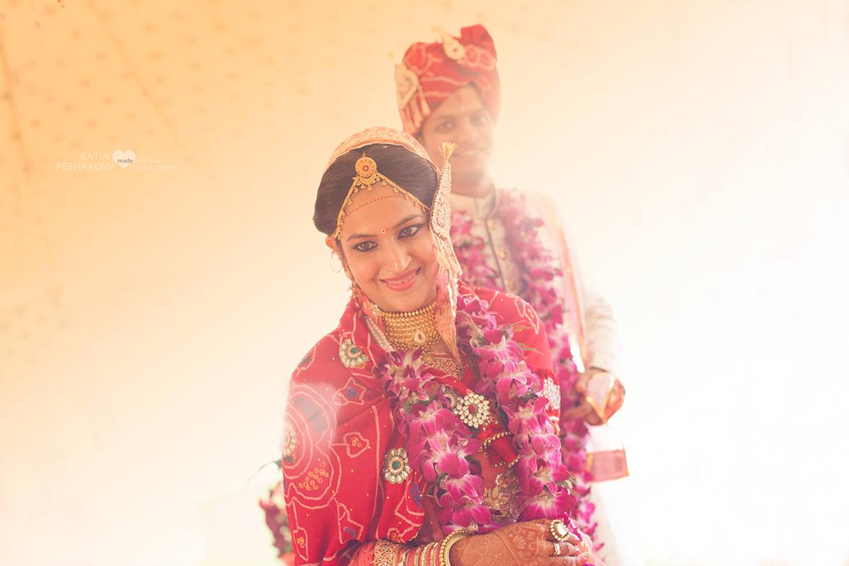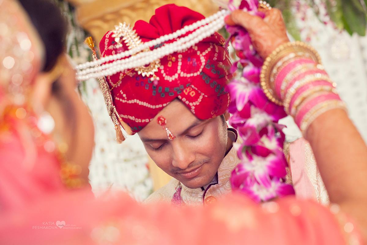 Держа в руках гирлянду из цветов, первый раз они поднимают глаза, чтобы посмотреть друг на друга. Это время для первой символической церемонии обмена гирляндами - джаймала.