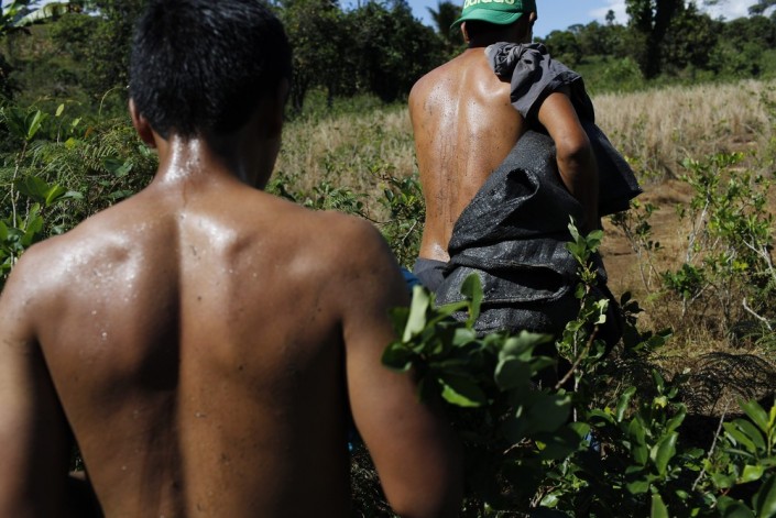 Молодые люди накрывают листья коки брезентом, чтобы они просушились. Владельцы плантаций продают оптовикам килограмм листьев коки за 3,5 доллара, а те поставляют их наркоторговцам. Это в два раза больше, чем зарабатывают фермеры, выращивающие кофе или какао.
