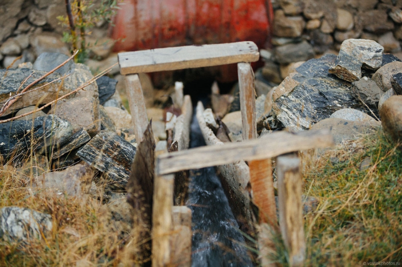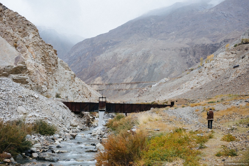 Насладившись чаем и угощениями, мы было собрались ехать дальше, но Давладбек предложил сходить на водяную мельницу, которую он построил сам. Нам стало интересно, и мы пошли куда-то вверх по горному ручью. Металлическая конструкция на фотографии - это часть арыка, который опоясывает холмы и идет через поселки вниз по течению Пянджа. Фрагмент огромной оросительной системы, построенной еще во времена Союза и работающей по сей день. Избытки воды из системы арыков сбрасываются в горные ручьи с помощью ручных металлических затворов.