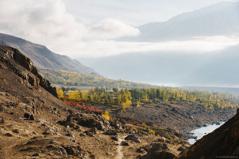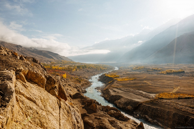 Слева за узким ущельем реки виднеются афганские дома и поля.