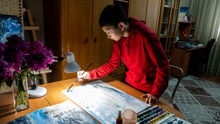 Его картины выставлялись в Париже. 13-летний художник из Алматы создает шедевры за 15 минут Фото © Андрей Зайцев