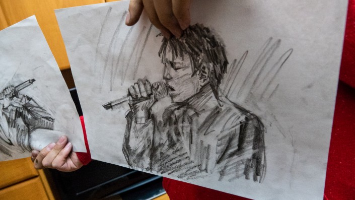 Собеседник из папки достает наброски с певцом Димашем Кудайбергеном. "Обожаю слушать хорошую музыку. Мне нравится, как поет Димаш. Я нашел его фотографии и сделал несколько набросков с его силуэтом. До этого писал участника группы A'Studio Байгали Серкебаева, подарил портрет кинорежиссеру Акану Сатаеву. Родных люблю рисовать. А знакомых еще не приходилось", - делится алматинец.