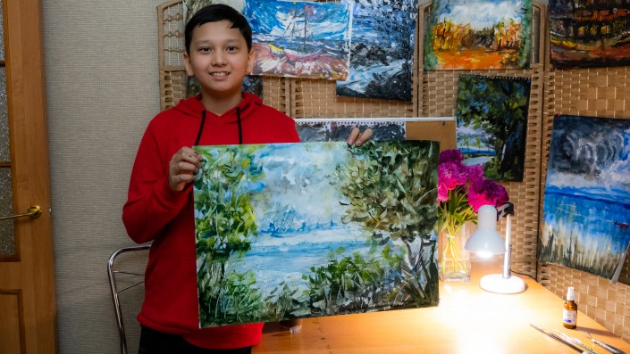 Его картины выставлялись в Париже. 13-летний художник из Алматы создает шедевры за 15 минут