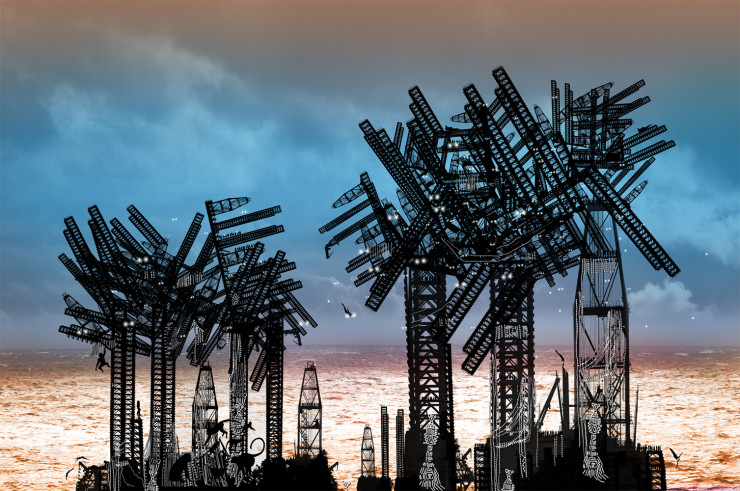 "На острове каспийских пальм живет счастливый народ, созданный из древнейшей крови титанов. Его представители достигают весьма преклонных лет. Их жизнь сопровождается песнями, танцами. Остров этот всегда ярко освещен, его климат - благодатен. Каспийские пальмы являются для местных жителей храмами, на их вершинах справляется всем обществом культ мира и звучат святые гимны спасения китов. На острове неизвестны раздоры и болезни. Смерть приходит к народу как избавление от пресыщения жизнью в экономическом чуде, и они, испытав все наслаждения, бросаются в море", - рассказывает автор о фантастической картине.
