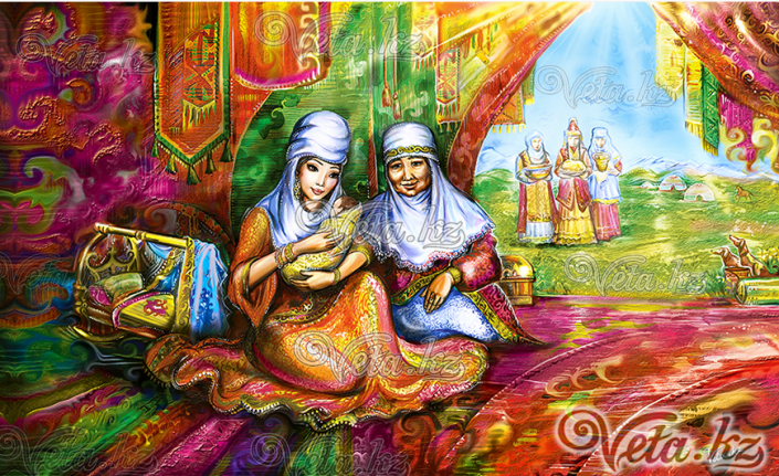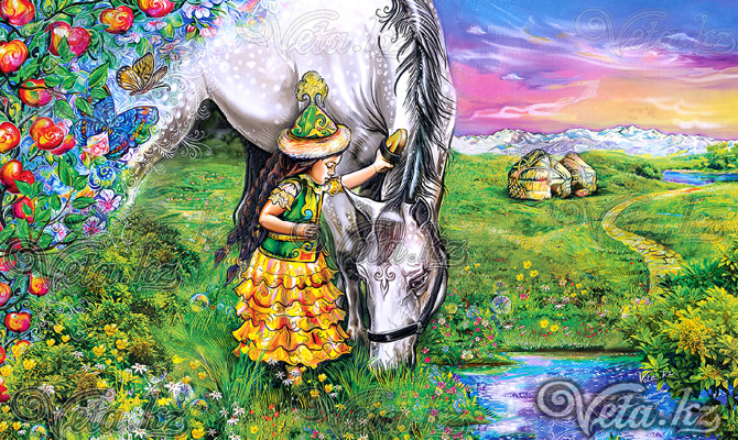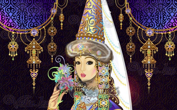 Именно поэтому Вета использовала такие яркие краски. Конкретных персонажей в коллекции нет. К примеру, при создании картины "Қыз Жібек пен Төлеген" у художницы была цель изобразить просто влюбленных - парня и девушку в казахских нарядах, а также показать чувства между ними. Изначально художница хотела нарисовать красивые, сказочные композиции, связанные с казахским эпосом, но безо всякой привязки к героям.