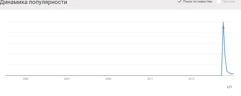 Кстати, интересна кривая, отображающая всплеск популярности Сабины Алтынбековой. До 2013 года таких запросов в Интернете вообще не было, а затем мы можем наблюдать, как линия на графике резко поднялась вверх, по вертикальной прямой: