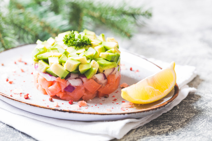 "Семга кубиками, томаты, кедровые орешки, перепелиные яйца перемешать, добавить рукколу и базилик, заправить оливковым маслом".