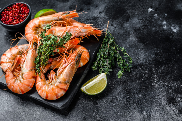 "Креветки в ананасе, запеченные со сливками и сыром.  Ананас разделить на две части, вырезать мякоть, нарезать ее. Креветки помыть и очистить. Перемешать мякоть ананаса с креветками, посолить, поперчить и полить лимонным соком. Начинку выложить в ананас, полить сливками и посыпать сыром, затем - в духовку".
