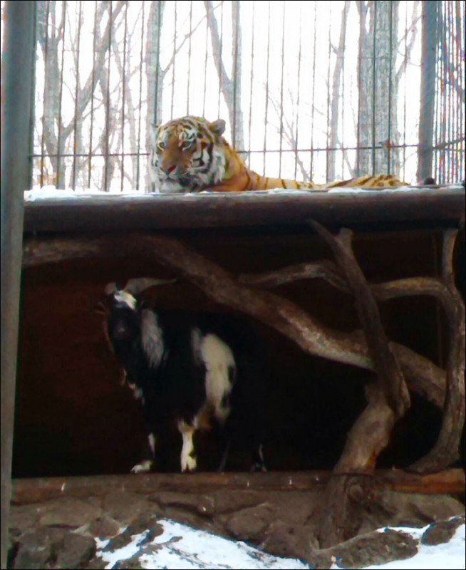 Удивительный случай произошел в сафари-парке в Шкотовском районе Приморья (Россия). Амурский тигр по кличке Амур отказался есть живую добычу, которую работники парка приготовили хищнику, - козла Тимура.