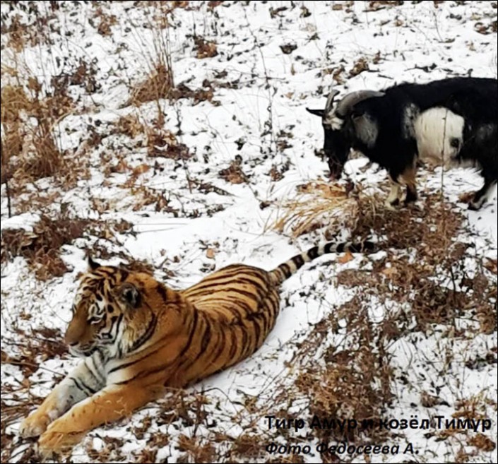"Однажды был такой случай, что тигр не стал есть козла, когда тот дал ему отпор, но животного хватило на сутки - козел дал слабину, и хищник убил его одним ударом. Но тут другая ситуация. Тимур всюду ходит за Амуром, а тигр спокойно его терпит. Козел даже волнуется, когда тигр пропадает из поля его зрения, и тут же начинает его искать", - добавил Мезенцев.
