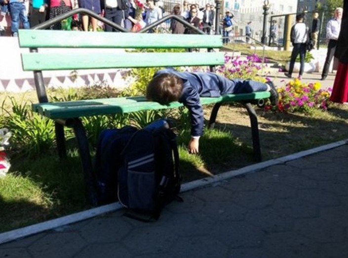 1 сентября - главный праздник всех школьников. Но линейки часто проходят скучно. К тому же приходится стоять под палящим солнцем. Уж очень сложно вытерпеть. Вот и малыш из костанайской школы #2 не выдержал, да прилег на скамеечку подремать, пока чиновники зачитывали поздравления.