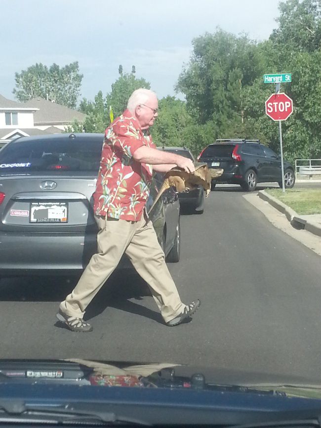 Мотоциклист остановился, чтобы перевести бабушку через дорогу.