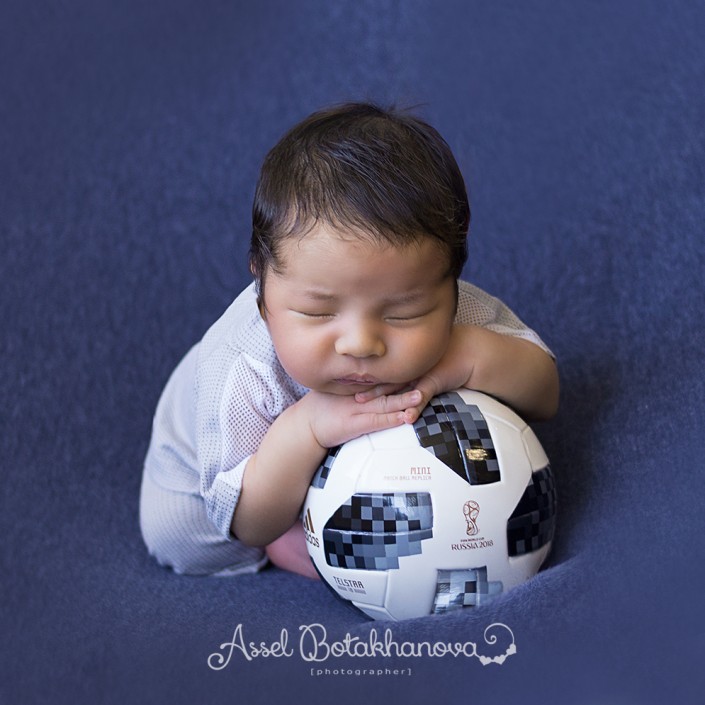 А на следующем снимке малыш по имени Зидан. "Мне стало интересно, почему у мальчика такое необычное имя. Оказалось, папа любит футбол, болеет за ФК из Стретфорда "Манчестер Юнайтед". Тогда мы решили все это смиксовать. Я сшила для него футбольную форму с логотипом Манчестера и указала на экипировке счастливый номер 7 с его именем. Фото получилось символичное", - объясняет Асель.