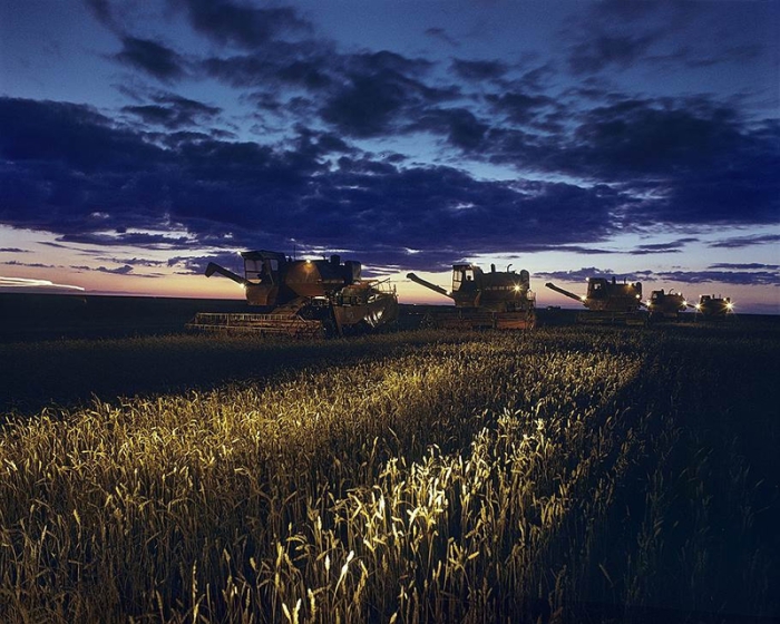 Сельскохозяйственные машины работают днем и ночью в совхозе "Восход" в Северо-Казахстанской области.