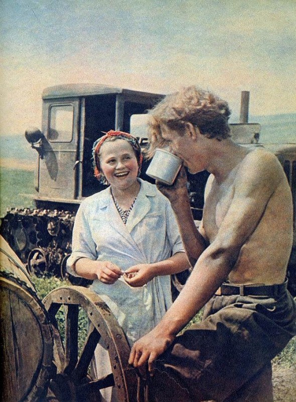 Разговор тракториста и женщины-повара во время обеденного перерыва.