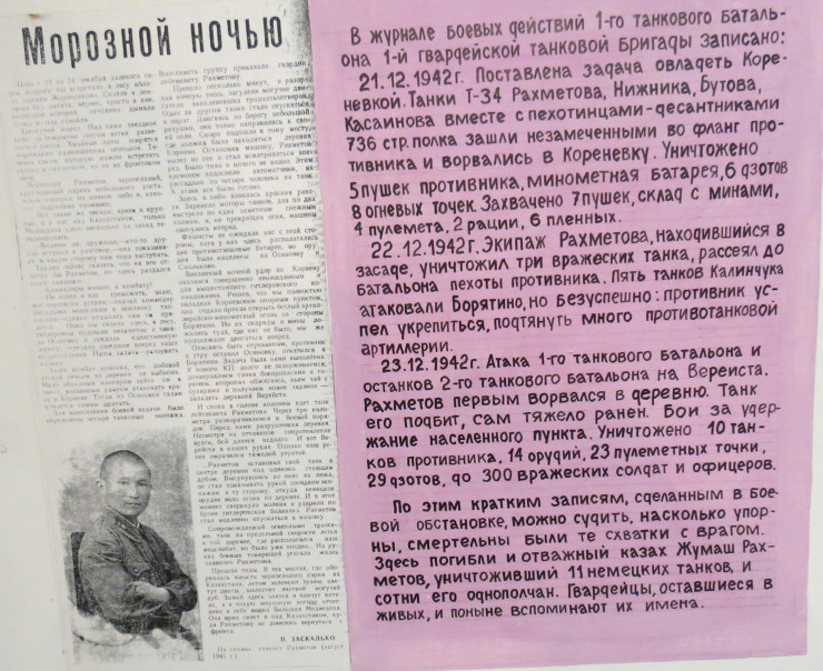 Хочется поблагодарить администрацию и жителей поселка Оленино, поскольку они в моих глазах они - герои современности, герои мирного времени, так как несут светлую память о бойцах прошлого, в том числе и о наших, казахстанских солдатах. От них же я узнал о нашем земляке - командире взвода 2-й роты 1-го танкового батальона гвардии старшем лейтенанте Жумаше Рахметове.