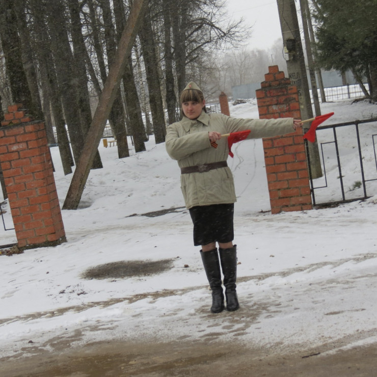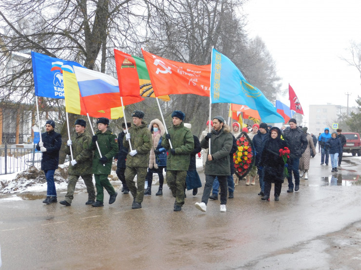 На второй день мы с делегацией участвовали в демонстрации - марше мирных жителей к памятным местам захоронения советских солдат, где мне выпала неожиданная для меня, особая честь. Я, будучи в гражданской одежде, с трепетом и ответственностью в колонне нес флаг своей страны - Республики Казахстан, наряду с ребятами в форме, которые несли флаг России, флаги Оленинского района и Тверской области и знамя Победы.