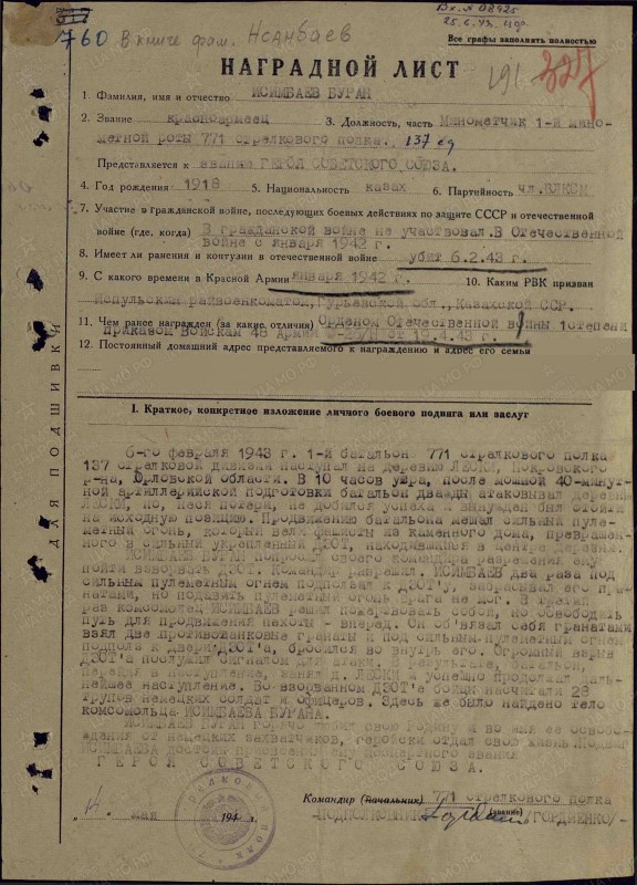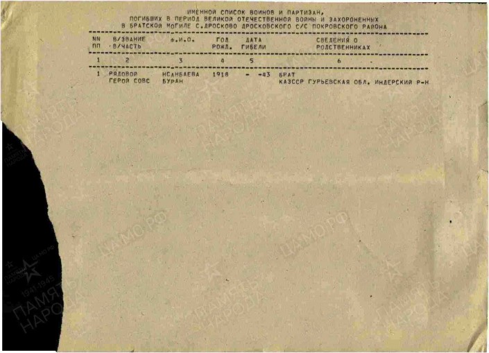 С фамилией героя тоже вышла путаница, ее считали труднопроизносимой, что усложнило поиски казахстанца. Даже в наградном листе его называют Исынбаевым.